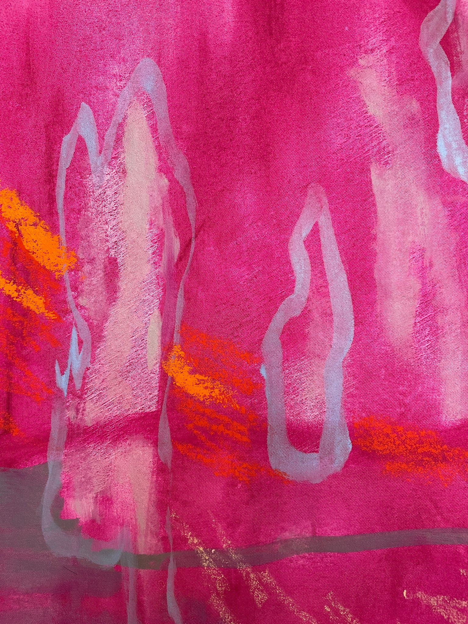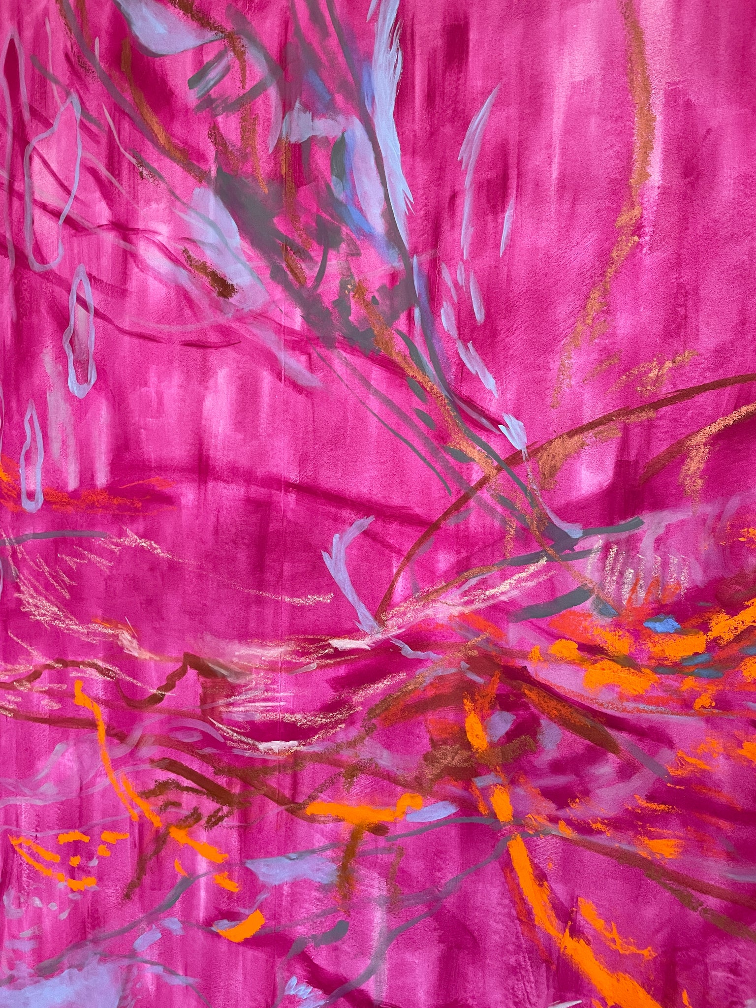 Auf einem strukturierten Hintergrund in kräftigem, leuchtenden Pink erstrecken sich strahlenförmig in alle Richtungen strebende futuristische Formen. Die vornehmlich linienhaften, teilweise durchbrochenen expressiven Pinselstriche sind in Weiß, hellem Creme, Orange, hellem Blau und Grau gehalten. Spacelights ist ein Symbol für Kraft und Mut, für positive, gute Gedanken, die sich vervielfältigen, wie Licht, welches sich tausendfach in Kristallen bricht. Die Technik ist Öl und Ölkreide auf Leinwand. Meine Bilder sind vorne und rückseitig signiert.